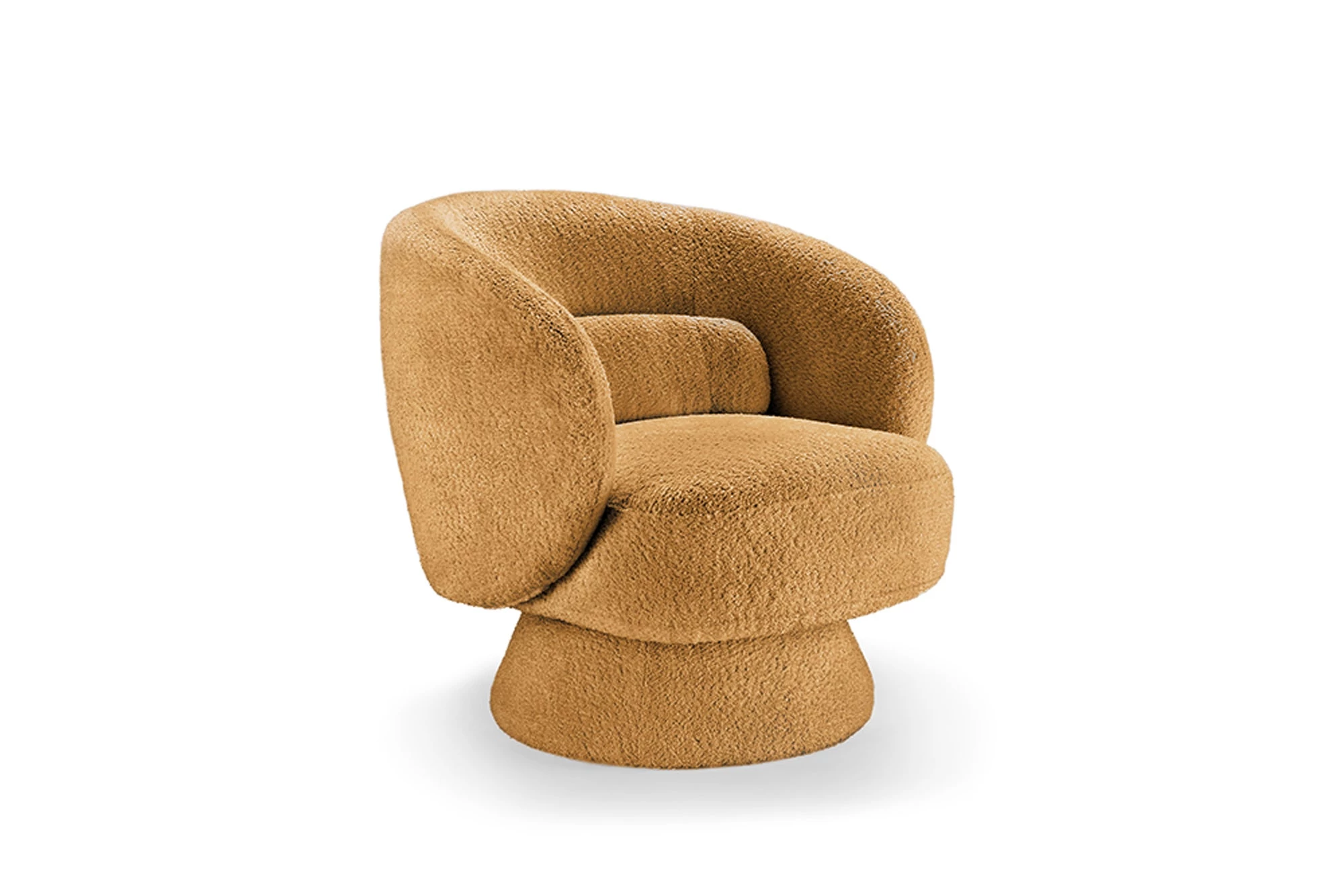 A BOSSA NOVA forgófotel modern, kényelmes és letisztult darab, amely a 360°-os forgatható funkciónak köszönhetően praktikus és rugalmas használatot biztosít. A puha bouclé kárpitozás elegáns sárga árnyalatban időtlen stílust kölcsönöz bármely nappalinak vagy dolgozószobának.