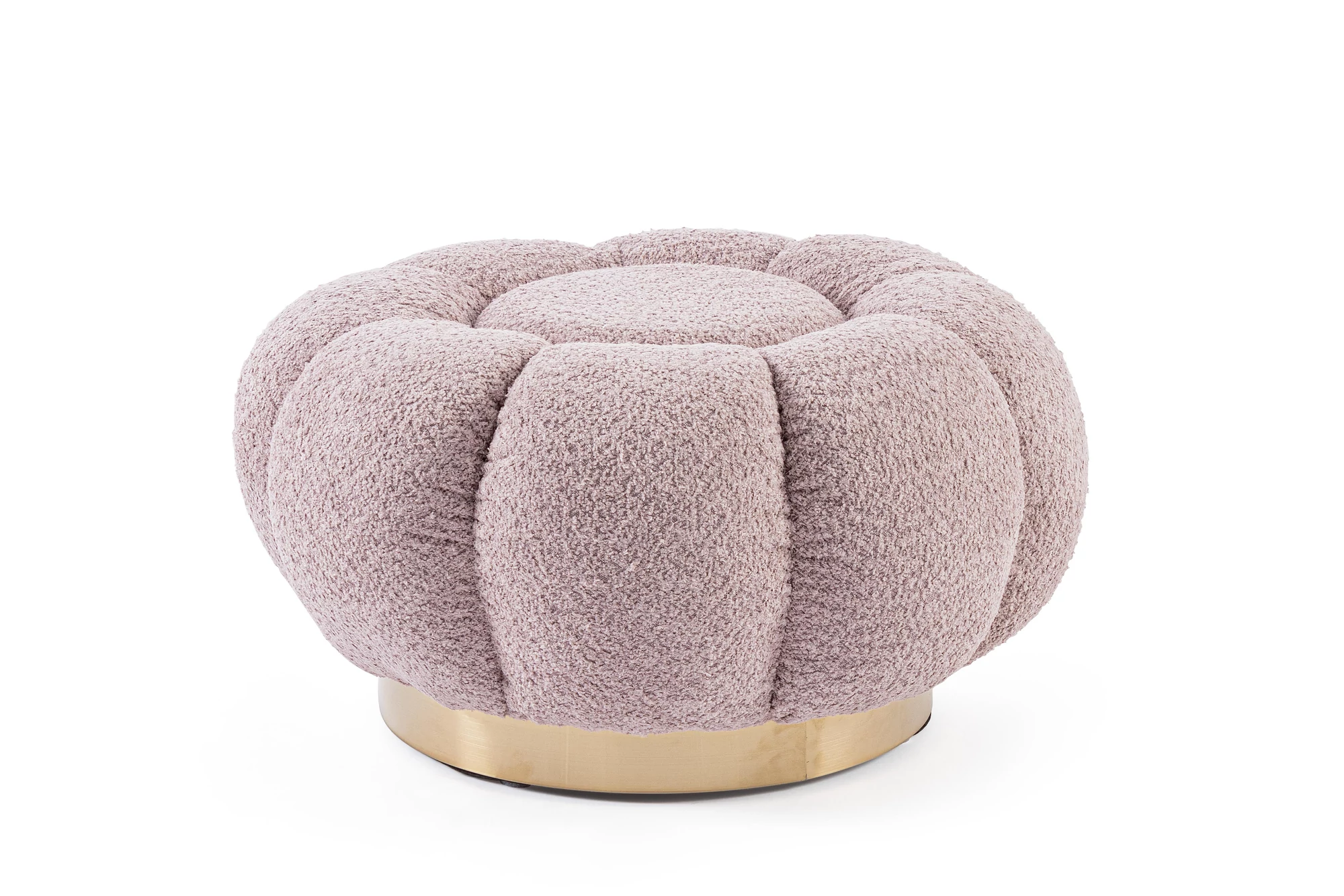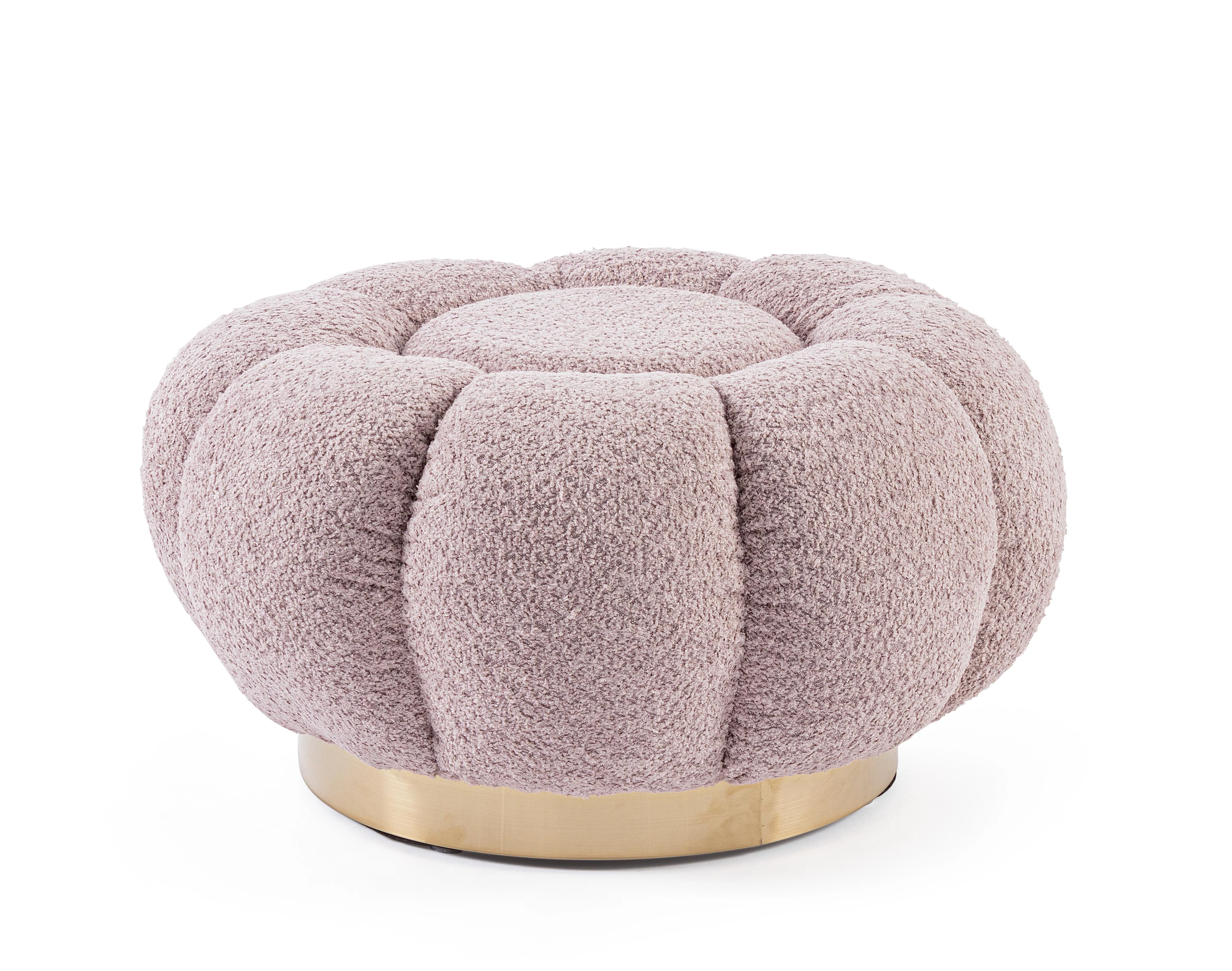 A FLOREL puff letisztult formavilágával és texturált bouclé szövetével a modern enteriőrök kedvence. A kényelmes, poliuretán habbal töltött ülőfelület tökéletes komfortot nyújt, míg az aranyszínű acél díszgyűrű lábazat elegáns megjelenést ad a darabnak.