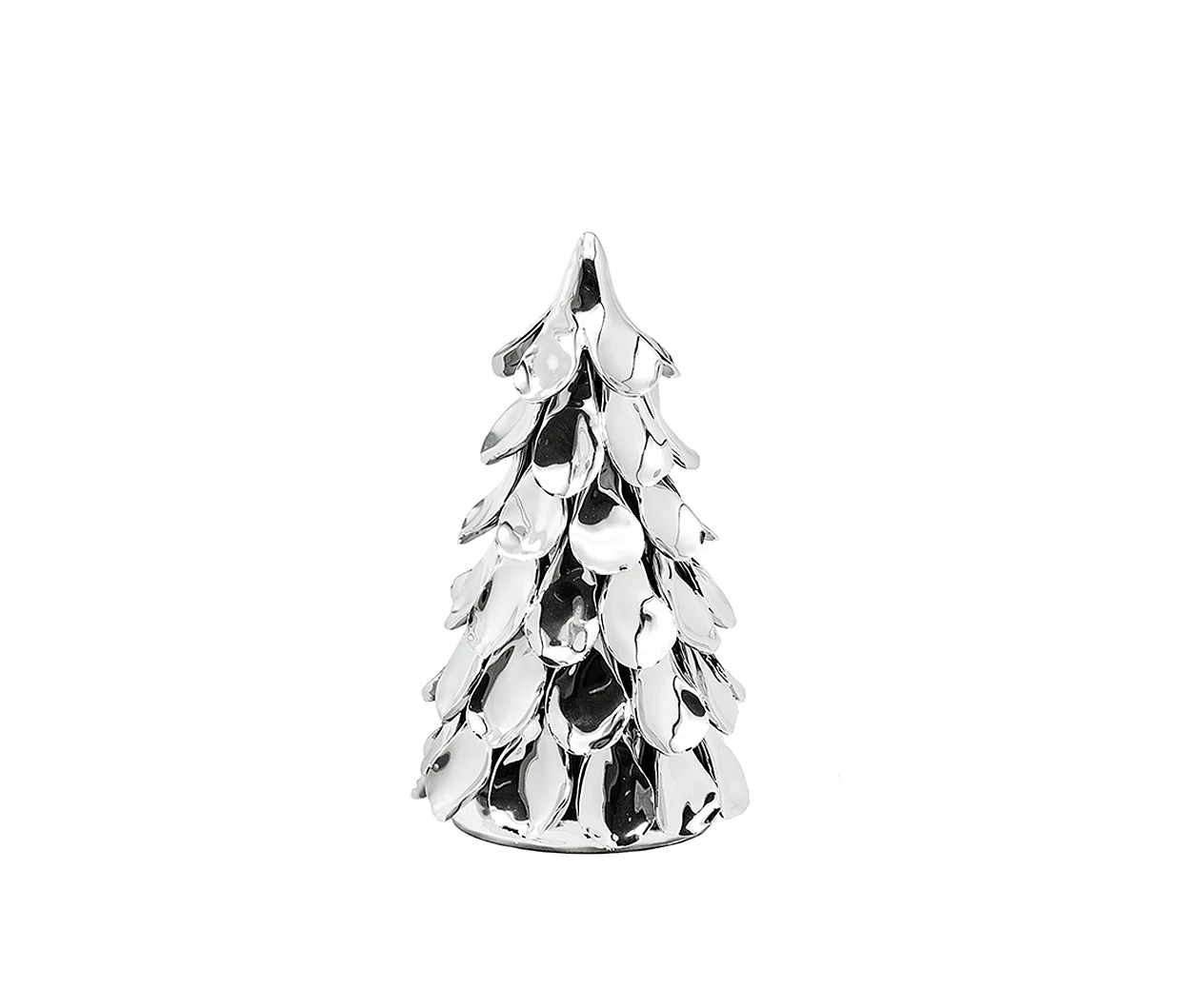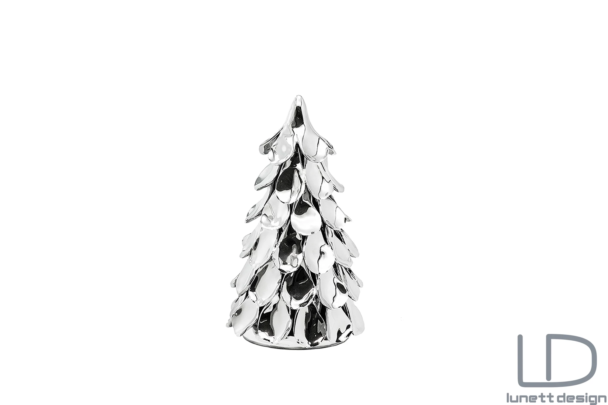 Ezüst színű fenyőfa dekoráció. Gyönyörű, fényes felülete révén elegáns kiegészítő az ünnepi időszak díszítéséhez.