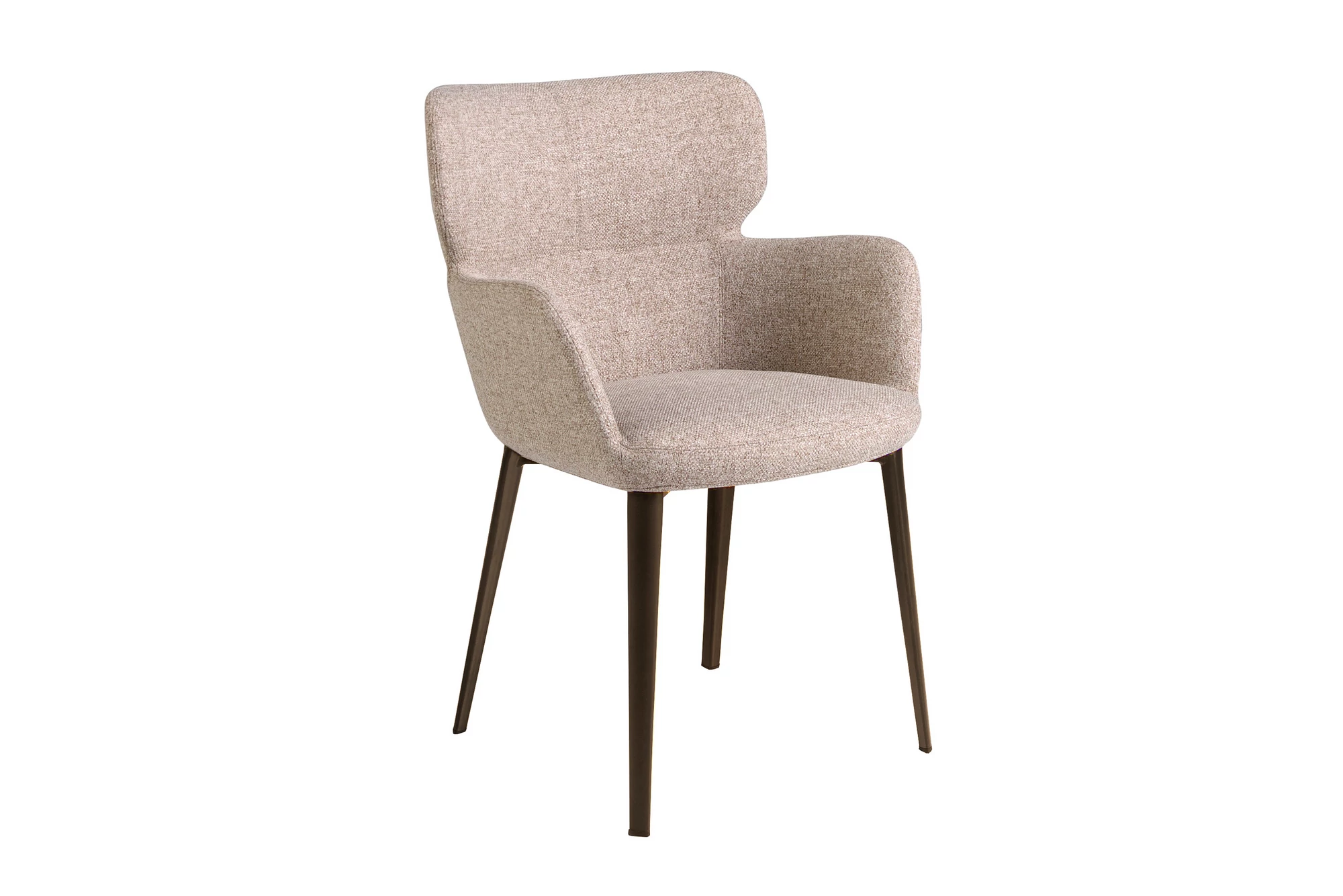 Modern dizájnú, karfás szék barna, texturált szövetkárpittal és diószínű rozsdamentes acéllábakkal. A 25 kg/m³ sűrűségű poliuretán hab töltet és a kényelmes háttámla gondoskodik a maximális kényelemről. Letisztult, mégis karakteres megjelenése tökéletesen illik modern étkezőkbe vagy konyhákba. A kiváló minőségű anyagok tartós használatot és elegáns megjelenést biztosítanak. Egyedi formavilágával ez az Angel Cerdá szék stílusos kiegészítője lehet bármely enteriőrnek.